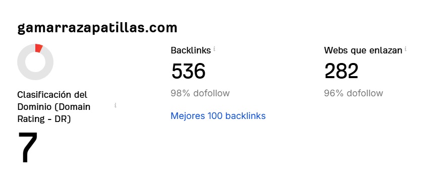 Otro ejemplo de éxito es GAMARRAZAPATILLAS.COM, con un Domain Rating de 7, más de 536 backlinks y 282 sitios enlazando casi en su totalidad dofollow. Estos resultados demuestran el valor de una estrategia de SEO bien ejecutada, incluso para sitios nuevos o en crecimiento.