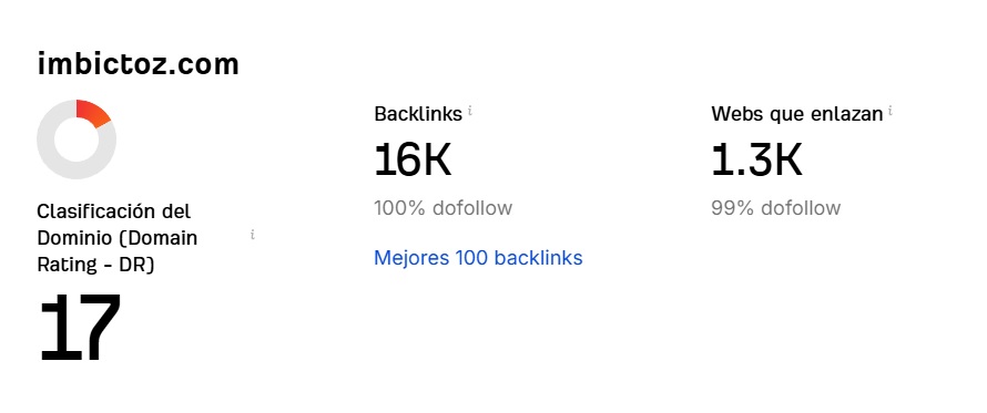 He logrado resultados medibles en sitios como IMBICTOZ.COM, que cuenta con un Domain Rating (DR) de 17 y más de 16,000 backlinks, provenientes de 1,300 sitios web de alta calidad y el 100% dofollow. Este respaldo de enlaces y la clasificación del dominio consolidan a imbictoz.com como una referencia confiable en el mercado de camisetas y artículos de fútbol en España.